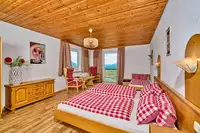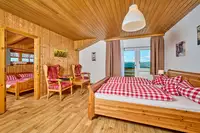 1 x abgeschlossenes Doppelbettzimmer für 3 Personen: Doppelbett, Schlafsofa, Dusche WC, Balkon mit Panoramablick