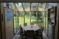 Terrasse mit Gartenstühlen, Fernsehgerät, Klettergerüst, Tischtennis, Ballspiele, Gesellschaftsspiele, CD-Player, 3 Autoparkplätze, Kaminofen, Liegestühle, Sauna, WintergartenKüchenausstattung: Geschirrspüler, Haushaltsherd, Kühlschrank, Backofen, Kippbratpfanne, Gefrierschrank/-truhe