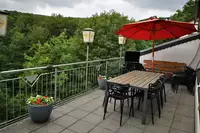 Aufenthaltsraum/Esszimmer (14 Personen), gut ausgestattete und moderne Küche, Nebenraum mit grosser Bartheke, Terrasse mit Grillgelegenheit, Gartenmöbel und herrlichem Aussicht auf das Rurtal.