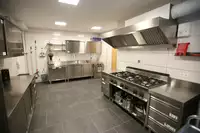 Die Küche ist ausgestattet mit gewerblichem Umluftofen, 6-flammigem Gasherd, großen Kühlschränken, einer Gefriertruhe, Gastronomie-Kaffeemaschine, Gewerbespülmaschine und vielem mehr.