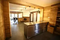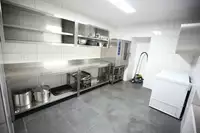 Die Küche ist rund um mit Arbeitsflächen ausgestattet und bietet somit ausreichend Platz für Ablageflächen und Zubereitungsmöglichkeiten. Sie ist vollständig aus Edelstahl. Der angrenzende Nachbarraum bietet ausreichend Stauraum für Ihre Lebensmitteleinkäufe und Getränkekisten.
