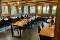Der Gastraum ist ein gemütlicher Raum mit großen Fensterflächen im Erdgeschoss. Hier können sie genüsslich Ihre Mahlzeiten einnehmen und schauen dabei auf die umliegenden Berge. Der Gastraum hat einen offenen Kamin und eine Theke. Die Theke ist komplett eingerichtet mit allen gängigen Gläsersorten, Musikanlage, Lichteffekt etc. Hier kann auch abends das Tanzbein geschwungen werden.