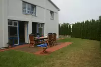 Indoor-Spielhalle mit Billard, Tischkicker und Tischtennis. Sichere Unterbringung von Motorrädern, Fahrrädern und Autogepäckträgern in benachbarter Bikegarage. Eigene Parkplätze kostenlos am Haus. Grünfläche mit eigener Terrasse mit Gartenmöbeln. Hecke zur Straße für Sichtschutz.