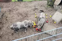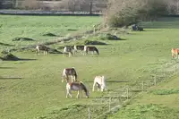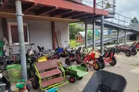 Tischtennisplatte, Schaukel und Sandspielplatz, Lagerfeuerplatz, zwei Reithallen, auch geeignet für Badminton, Fußball, Ringstechen zu Fuß usw., Tastwand, kleines Buchenlabyrinth im Garten, großer Pferdespielplatz mit Brücke und verschiedenen Hindernissen. Er ist auch sehr gut zum Spielen ohne Pferd geeignet und zum Zelten. Zwei Trampoline (drinnen und draußen)