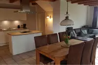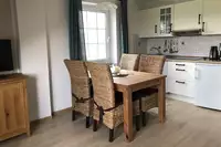 Für Gruppen bis 15 Personen bieten wir die ehemalige Wohnung der Bauernfamilie mit den beiden darüberliegenden Wohnungen und Zimmern als abgeschlossenen Bereich an. Die Wohnung hat einen großen Wohnraum mit einem massiven Esstisch und einer großzügigen Küche. Eine urige Holzdecke, z.T. alte massive Möbel und ein rustikaler Fliesenboden machen diese Wohnung besonders. Eine überdachte Terrasse mit Gartenzugang schließt direkt ans Wohnzimmer an, Grill und Lagerfeuerstelle sind vorhanden.