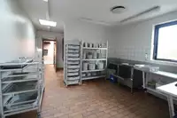 Der Küchentrakt mit Küchengeräten und eine separate Spülküche mit Speisekammer, Waschküche mit Waschmaschine und einer abgeteilten Tee/Kaffee-Küche. Es gibt drei große Kühlschränke und eine Gefriertruhe. Die Küche hat einen Elektroherd mit 4 Platten, 2 Gaskochtöpfe, eine Kipppfanne, 1 Rührmaschine, eine Profikaffeemaschine, zwei große Kochplatten für 25l-Töpfe mit Ausgusshahn und eine Kartoffelschälmaschine.