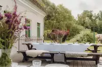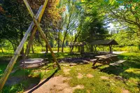 Grundstück ist umzäunt, Terrasse mit Tischen und Bänken, Rasensportplatz, Fußballtore, Tischtennisplatte, Schachaußenanlage, Backofen, große Lagerfeuerstelle und Grill.Extras