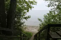Der Weg zum Strand führt über einen kleinen Weg durch ein kleines Waldgebiet und über einen Holzpfad.