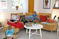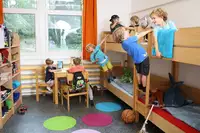 Das Gästehaus für Kinder & Jugendliche die " Freiluftschule Fischbeker Heide" kann drei Übernachter- und vier Tagesgruppen aufnehmen. Jeder Übernachter- und jeder Tagesgruppe steht ein Tagesraum zur Verfügung. Jede Übernachtergruppe hat ihr eigenes Haus mit Tagesraum, Waschräumen und WC.