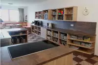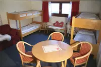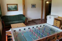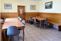 Die Gruppenräume liegen im Erdgeschoss: 2 große Speise- und Aufenthaltsräume mit TV, Video und DVD, kleiner Aufenthaltsraum mit Kicker, der meist als Leiterraum genutzt wird. Ein weiterer einfacher Raum (Indoor TT) kann mit Bierzeltbänken für die ganze Gruppe genutzt werden. 2 WC.Gut ausgestattete Küche: Ceranfeld mit 5 Kochfeldern, Backofen, Kippbratpfanne, 2 Spülmaschinen (Gewerbe und Haushalt), Fritteuse, Kaffeemaschine, Schneide- und Küchenmaschine, Mikrowelle, 2 große Kühlschränke, 2 große TK-Schränke.