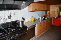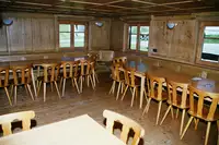 Mehrzweckraum ca. 120 m² mit Billardtisch, Fußballkicker, Tischtennisplatte, Trockenraum, Kamin, Autoparkplätze. Die Küche ist ausgestattet mit einem Großküchenherd, Geschirrspüler, Kühlschrank, Backofen und Gefrierschrank/-truhe.Das Haus besitzt einen großen Mehrzweckraum (unbeheizt - ehem. Tenne) der für Gruppenaktivitäten u.a. bei Regenwetter nutzbar ist. Im Haus ist ein TV mit DVD/Blueray-Player und eine Spielesammlung für drinnen und draußen vorhanden.