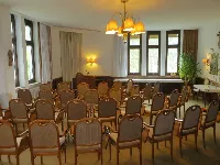 Der Konferenzraum bietet Platz für ca. 60 Personen. Er ist komfortabel bestuhlt (Stühle mit ausklappbarer Schreibfläche) und bietet eine angenehme Atmosphäre für Vorträge und Konferenzen. Er ist mit Beamer, Leinwand und Rednerpult ausgestattet und verfügt zudem noch über eine Lautsprecheranlage mit Mikrofon.
