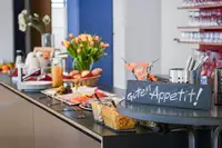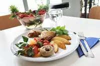 Wir bieten Vollverpflegung mit regionaler und internationaler Küche, die auch vegane und vegetarische Spezialitäten integriert.