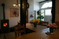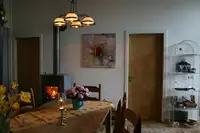 Alle Personen können gemeinsam in einem großen Wohnraum mit finnischem Specksteinofen an einem Tisch sitzen. Es befinden sich noch 2 weitere Öfen im Haus. Der Außenbereich verfügt über einen großen Garten mit großem Gartentisch sowie über eine überdachte Terrasse mit Sitzgelegenheiten.