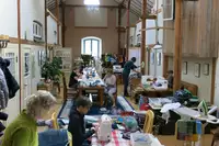 2 Gemeinschaftsküchen, 4 Backöfen, 2 Ceranherde, 9 Kühlschränke, 2 Gefrierschränke, 2 Mikrowellen, Geschirr für 40 Pers., Kaffeemaschinen, Toaster, Wasserkocher