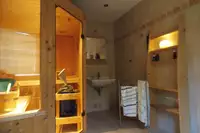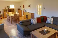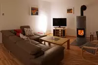 Großer Natursteinofen, elektrische Heizung, Sauna, 2 Bäder mit DU/WC, große Sitzecke, Smart-TV, Mikrowelle, div. Kaffeemaschinen, alle üblichen Küchenkleingeräte, Ceranfeld, Backofen, Spülmaschine, WLAN, großer Esstisch,