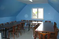 Das hintere Haus, mit einer überdeckten Terrasse, einem Aufenthaltsraum von 100m² und einer Küche im Erdgeschoss. 7 Zimmer, 16 Betten und ein Waschraum befinden sich auf der Etage, sowie ein zweiter Aufenthaltsraum von 20m² mit Küchenecke zugänglich von einer Aussentreppe.