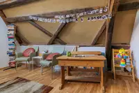 So gibt es eine gemütliche Bibliothek in der Ihr gerne in den Büchern schmökern könnt. Der Wellnessbereich mit wunderschöner Sauna ist im obersten Stockwerk, die Backstube im Erdgeschoss mit Jukebox und Häussler Backofen ausgestattet.