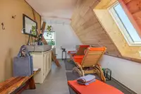 Im 3. Dachgeschoß haben wir eine Wellnessoase für Sie eingerichtet. Hier saunieren Sie wahrhaft paradiesisch. Die bequemen Saunaliegen laden zum Entspannen ein. Auch hier ist die Kombination von Alt und Neu, wie im gesamten Haus ein Merkmal, das die Gemütlichkeit entstehen lässt..