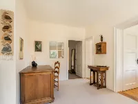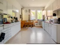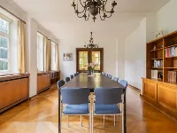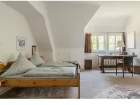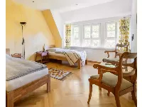 Das Haus wurde teilweise modern saniert, teilweise sind alte Ausstattung und Möbel, noch gut erhalten und gepflegt, vorhanden. Auf über 500qm verfügt es über ein großes Wohnzimmer, eine Diele, 8 Schlafzimmer und 6 Bäder im Obergeschoss. Im Erdgeschoss (Hochparterre) gibt es einen großen Gemeinschaftsraum, der als Essraum oder Seminarraum dienen kann, einen großen Flur, WC und eine große Küche.