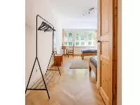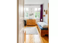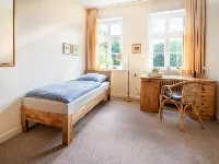 - Zimmer 1: eigenes Dusch-Bad, 2 x 1,40m Betten (einzeln oder als Doppelbett nutzbar, Schreibtisch + Stuhl, Kleiderstange, Sessel