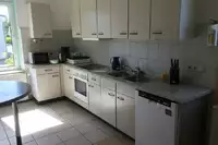Elektroherd, Kühl- und Gefrierschränken, Schränken, Arbeitsflächen, für bis zu 40 Personen ausreichendem Geschirr, Besteck, Gläsern, Töpfen, Kaffeemaschinen, Wasserkocher und Kochutensilien. Im Gruppenraum stehen 7 Tische und 40 Stühle. An der Wand hängt ein 65"-LED-TV.