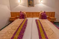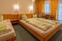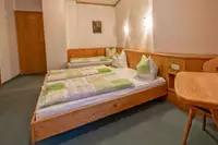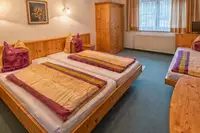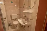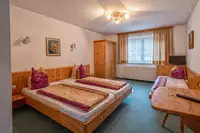Schlafzimmer mit Doppelbett, Einzelbett und TV und Badezimmer mit Dusche, Waschbecken, Toilette