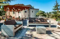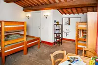 Selbstversorgerhaus - Alleinbelegung - 35 Betten - Swimmingpool - Terrasse - Zentrale Lage für Ausflüge Casa Pomponi liegt in den Weinbergen ca. drei Kilometer unterhalb von Montaione. Zum Kochen steht eine Gruppenküche mit Gastronomieherd, Backofen, zwei großen Kühlschränken mit Eisfach zur Verfügung. Gegessen wird im Speiseraum oder auf der Terrasse.Neben den Mehrbettzimmern im Obergeschoss lädt auch ein gemütlicher Kaminraum zum Verweilen ein. Duschen und WC findet man auf der Etage. Im Haus sind 25 Betten aufgestellt, im Nachbarhaus befinden sich ein 3-Bettzimmer und ein 7- Bettzimmer inkl. Dusche und WC (ab einer Belegung von 22 Personen). Bei Bedarf können weitere 8 Betten in den Appartments gegen Aufpreis dazu gebucht werden.