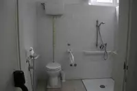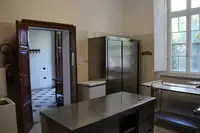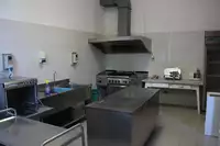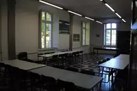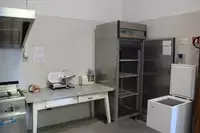 Im Erdgeschoss verfügt diese Gruppenunterkunft über eine gut eingerichtete Gewerbeküche, einen großen Esssaal (für bis zu 100 Personen) und einen weiteren Aufenthaltsraum. Neben einem behindertengerechten Dreibettzimmer gibt es im EG auch ein behindertengerechtes Bad (WB, WC und Dusche).