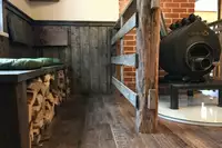 Nachtspeicheröfen, Holzofen im Aufenthaltsraum, Deckenheizkörper
