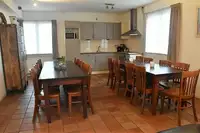 Es gibt einen schönen, hellen Aufenthaltsraum im Gruppenhaus mit Tischen und Stühlen und einer gemütlichen Fernsehecke.