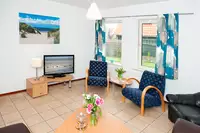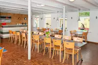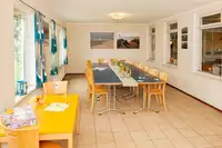 Ein Wohnzimmer mit Sofas und Fernseher eignet sich, um einen langen Tag ausklingen zu lassen. Der große Aufenthaltsraum mit ausreichend Tischen und Stühlen und kleiner Bar bietet genügend Platz für 45 Gäste.