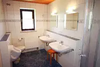 Gruppen bis 60 Personen in 16 Zimmern (mit 2/3/4/5-Betten) möglich, 11 davon mit DU/WC, für die restlichen 4 Zimmer im abgeschlossenen Wohnbereich stehen 2 große Bäder mit 1 x Wanne, 2 x Dusche, 4 Waschbecken, 2 WC und 1 Urinal zur Verfügung.Im Erdgeschoss befindet sich das rollstuhlgerechte Zimmer mit 4 Betten, daneben das WC und die Behindertendusche über den Flur.