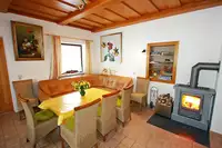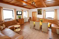 Das gemütliche Kaminzimmer für den Plausch in der kleinen Runde hat 1 Polstersitzgruppe mit großem Tisch in einer großen Sitzrunde, dazu noch eine Polsterecke mit kleinem Tisch und den Wärme - und Gemütlichkeit ausstrahlenden und hochwertigen Specksteinofen und einen neuen Flachbildschirm an der Wand, da bleiben keine Wünsche offen (!).