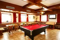 Kaminzimmer, Thekengastzimmer, Gemeinschafts-Speiseraum, Spiel- und Aufenthaltsraum, mit Billard und Orgel. 70 mögliche Sitzplätze, ohne Kaminzimmer.