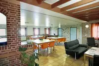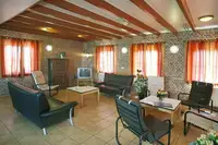 Der ziemliche große Ess- und Aufenthaltsraum des Gruppenhauses, ist mit ausreichend Tischen und Stühlen ausgestattet und hat eine gemütliche Sitzgarnitur aus Leder im Aufenthaltsbereich. Hier befinden sich auch Fernseher und DVD-Spieler.
