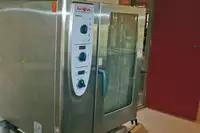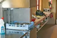 - Küche mit Elektroherd, Konvektomat, Kippbratpfanne, Industrie-Geschirrspüler, großem Kühlschrank und Abstellraum