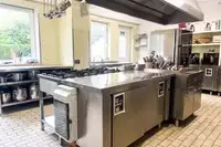 Die große Gastronomieküche ist vollständig ausgestattet von Gasherd, Konvektomat und Fritteusen bis hin zu Profi-Spülmaschine, Kühl- und Gefrierschränken. Teller, Gläser, Besteck, Gewürze und Öl sind bereits vorhanden, sodass ihr sofort loskochen könnt. Wer sich lieber verwöhnen lässt, kann Frühstück, Catering oder ein Barbecue dazubuchen. Getränke stehen vor Ort gekühlt bereit, abgerechnet wird nur, was ihr wirklich verbraucht.
