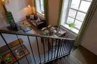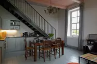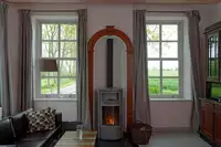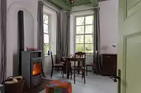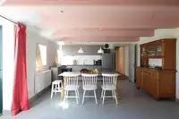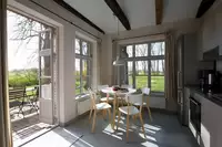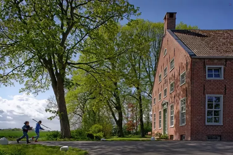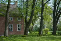 Im ehemaligen Kuhstall gibt es eine weitere Wohnung für sechs Personen sowie einen Gemeinschaftsraum, der zusammen mit den Wohnungen gemietet werden kann. Er ist mit einer Küche ausgestattet und bietet Platz zum Feiern, Kinoabende oder Schlemmen an einer langen Tafel. Zum Hof gehört ein großes Grundstück mit alten Bäumen, einer Gracht und einem kleinen Teehaus (der perfekte Platz für eine Tasse Ostfriesentee!).