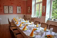 Unser historisches Gutshaus, 1862 erbaut und teilweise mit Antiquitäten ausgestattet, persönlich und mit Flair eingerichtet, ist ideal geeignet für Familienfeiern oder Familientreffen, Brainstormings und kleine Seminare, Freundesgruppen für historische Gutshäuser und Naturliebhaber, Yogagruppen u.v.m. Zudem bieten Ihnen unsere großzügigen Räumlichkeiten, wie Frühstücks- und Kaminzimmer, großem Wohnzimmer mit TV und Kamin, einem rd. 60 qm großem Bibliotheks- und Seminarraum sowie dem Gutshausgarten alle Möglichkeiten für Ihre Gruppe.Eine komplett eingerichtete Küche mit gemütlichem Esszimmer (Eulenstüberl) mit ca. 20 Plätzen, und direktem Ausgang zum Garten, ist ideal für Ihre Selbstversorgung. Die Nutzung der kompletten Küche mit Herd, Ofen, Mikrowelle, Kühlschrank, Kaffeemaschine, Geschirr, Gläser und Spülmaschine steht Ihnen und Ihrer Gruppe dann zur Verfügung.