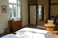 Das Nichtraucher Gästehaus bietet 6 großzügige Gutshaus-DZ mit Bad/WC und Aufbettungsmöglichkeit und jeweils gemütlicher Sitzecke, sowie 2 Low-Budget-DZ mit einem gemeinsamen Bad/WC. Mit maximal 20 Betten und unseren großzügigen Räumlichkeiten im Haus und dem Gutshausgarten, bieten wir alle Möglichkeiten für einen gelungenen Gruppenaufenthalt in unserem individuell geführten Gästehaus.