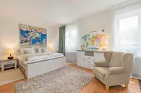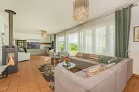 Das Haus verfügt über vier Schlafzimmer für 10 Personen – drei Doppelzimmer und ein Familienzimmer mit Doppelbett und Doppelstockbett. Zusätzlich steht ein Bauwagen als gemütliche Schlafmöglichkeit für weitere 4 Personen (2 Erwachsene, 2 Kinder) im Garten zur Verfügung (ohne WC - hier muss das Haupthaus genutzt werden). Im Sommer, wie Winter nutzbar.Das 45 m² große, helle Wohnzimmer mit XXL-Couch Landschaft, Kamin und TV - mit Blick in den Garten und aufs Wasser - lädt zum gemütlichen Beisammensein in großer Runde ein. Über die offene, vollausgestattete Küche, haben Sie Zugang zur Terrasse mit großzügiger Sitzmöglichkeit und zum Garten.