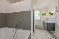 Ein Badezimmer mit Dusche, WC & Waschbecken (Warmwasser) befindet sich direkt in einem der Schlafzimmer. Zusätzlich gibt es ein weiteres großes Badezimmer mit Wanne, Dusche, WC und breitem Handwaschbecken. Hier können Sie warme Duschen & Bäder genießen. Aus dem Handwaschbecken hier läuft kein Warm-Wasser. Mit einem separaten Gäste-WC mit Waschbecken (Kalt-Wasser) sorgt dieses Haus für genügend Privatsphäre, welches sich komplett auf einer Ebene im EG befindet.