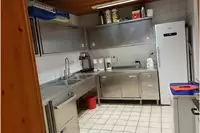 Gastronomiegasherd mit vier Kochstellen und einem E-Backofen, Gaskocher, elektr. Kippbratpfanne, elektr. Brotschneidemaschine, Industriegeschirrspülmaschine (Spülmittel inkl.), Geschirr und Besteck für 50 Personen, großer Kühlschrank, kleiner Gefrierschrank, Doppelkaffeemaschine, Wasserkocher.
