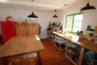 Küche 2: 1 Kühl-Gefrierkombination, 1 Kühlschrank, 1 Arbeitstisch, Hocker, Arbeitsplatte, Geschirrschrank