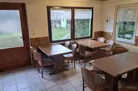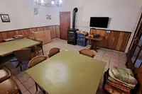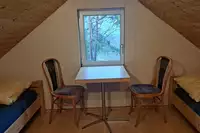 Im Erdgeschoss befindet sich das vierte Zimmer – ein Fünfbettzimmer mit zwei Doppelstockbetten und einem Einzelbett. Ebenfalls im Erdgeschoss befinden sich die beiden Aufenthaltsräume. Hier ist Platz für bis zu 16 Personen bzw. 14 Personen. Der größere Raum hat einen Kaminofen, für gemütliche Stunden am Abend.