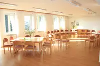 Werkraum, Spielzimmer, Sporthalle, Tischtennisraum, Meditationsraum, Lesezimmer, Kindergartenraum, Waschmaschine, Trockner, Kühlschrank, Wickeltisch, Hauskapelle, Diaprojektor, Overheadprojektor, Beamer, Fotokopiergerät, Fernsehgerät, Videorecorder, Stereoanlage, Ballspiele, Tischtennisplatte, Fußballkicker, Billardtisch, Klavier, Gesellschaftsspiele, Seminarausstattung, Cafeteria mit großer Terrasse, 30 Parkplätze