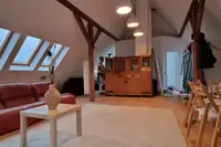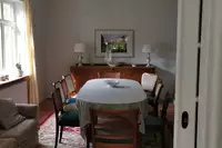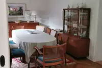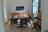 Der zweiteilige Wohnbereich im EG 47 qm, Raumhöhe ca. 300 cm, besteht aus dem Esszimmer (Essplatz für 10 Personen), das durch eine doppelte Schiebetür abtrennbar ist. Dort befindet sich auch ein Doppelschlafsofa , so dass in 7 Räumen Schlafgelegenheiten verfügbar sind.