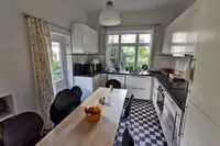 In der weißen modernen, gut ausgestatteten Küche, in der auch Elemente der Dreißiger Jahre erkennbar sind (Durchreiche, Fliesenbordüre und Bodenfliesen....), finden an einem Esstisch 10 Personen Platz.