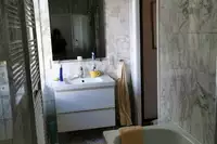 Das Bad im OG wie auch das Gäste WC sind mit Marmor ausgestattet. Auf dieser Etage befinden sich drei weitere Schlafzimmer mit 3 Doppelbetten, 1 Schlafsessel und 1 Einzelbett .